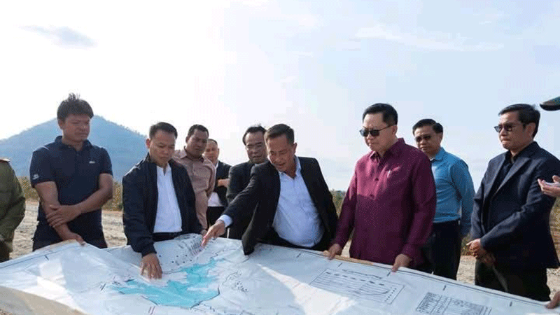 Minister of Agriculture and Environment Dr Linkham Duangsavanh and his officials on Friday monitor the construction of the Huayvangha reservoir, which will expand the water supply for people in Phonthong district, Champasak province. The site visit followed a national meeting to review the work carried out by the ministry in 2025 and outline plans for 2026. --Photo Pasaxon |