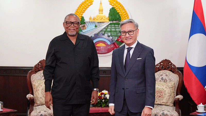 Minister of Foreign Affairs Mr Thongsavanh Phomvihane (right) on Friday receives the Ambassador of South Africa to Laos, Mr Darkey Ephraim Africa. The two officials expressed strong appreciation for the friendship and good cooperation between their respective countries, which they observed has strengthened over the 32 years since Laos and South Africa established diplomatic relations in 1994. --Photo Ministry of Foreign Affairs |