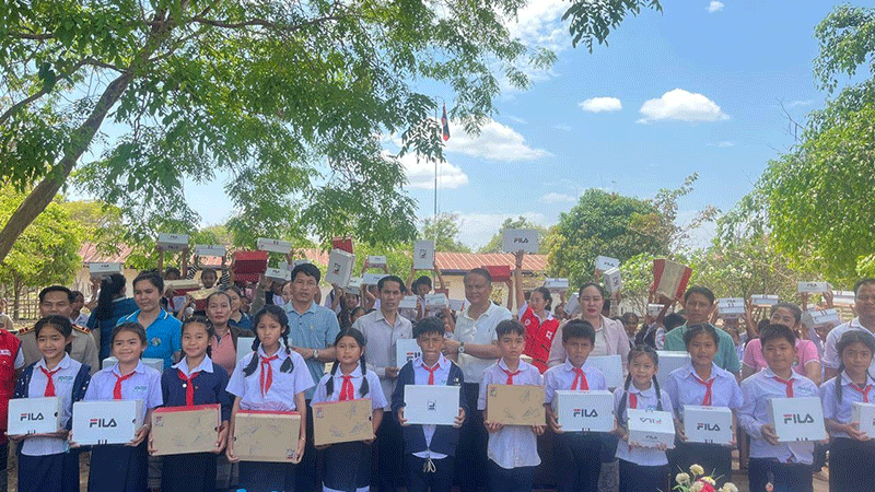 Staff from Champasak province’s Red Cross and Champasak district authorities on Friday deliver 234 pairs of sneakers to students at Huayngeun village lower secondary school and Maytha village primary school. --Photo Champamai newspaper |
