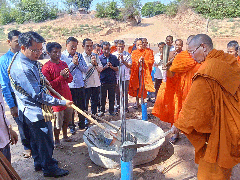 Monks, Soukhouma district authorities and local residents on Monday take part in an auspicious ceremony to mark the start of construction of a bridge in Soukhouma district, Champasak province. The bridge will facilitate travel between Lath, Phon, Phaktob and neighbouring villages. --Photo Champamai newspaper |