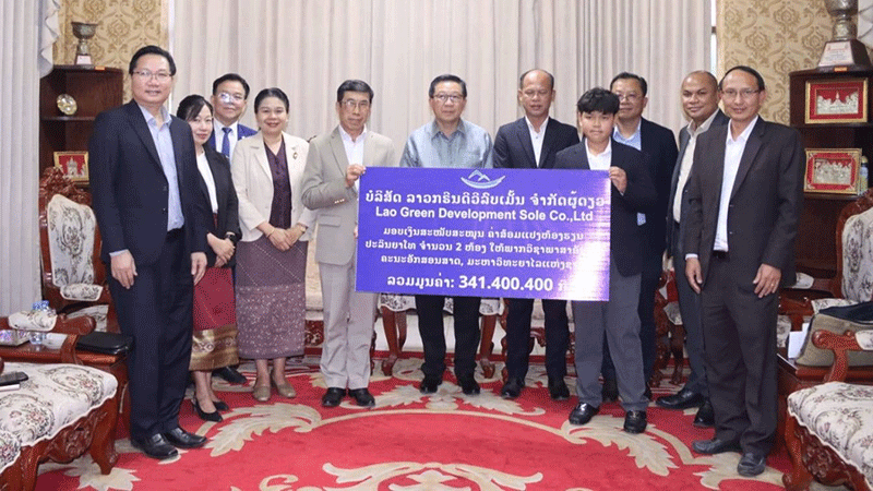 Lao Green Development Sole Co., Ltd. executives last week donate more than 340 million kip to the National University of Laos to finance the renovation of two lecture theatres in the English Department of the Faculty of Letters. Minister of Agriculture and Environment and President of the University Council, Assoc. Prof. Dr Linkham Douangsavanh, and other officials were present on the occasion. --Photo Education Science and Sport News |