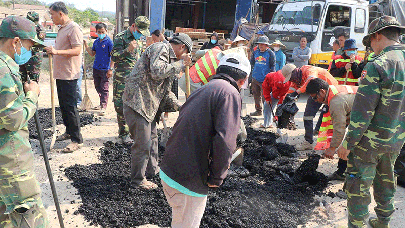 Vilabouly district authorities and other government officials supervise repairs to main roads in Savannakhet province last week. The cost of the repairs, amounting to US$2,350, is financed by Lane Xang Minerals Limited. --Photo Vientiane Mai |