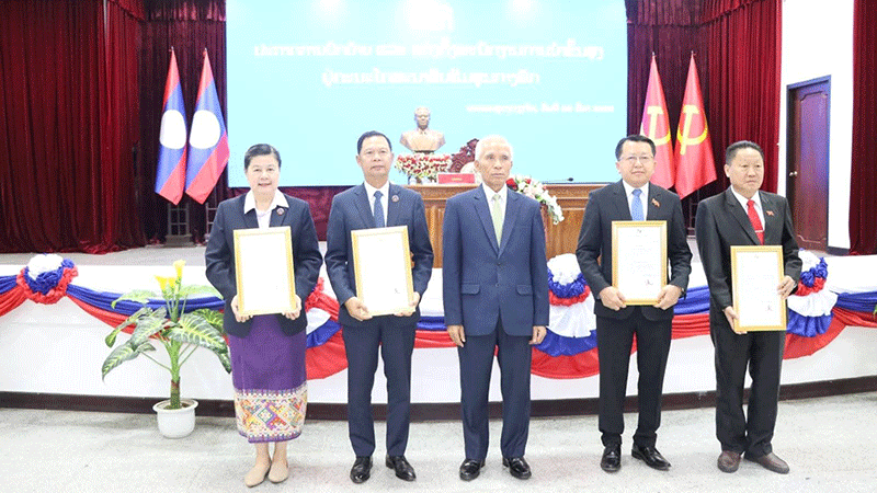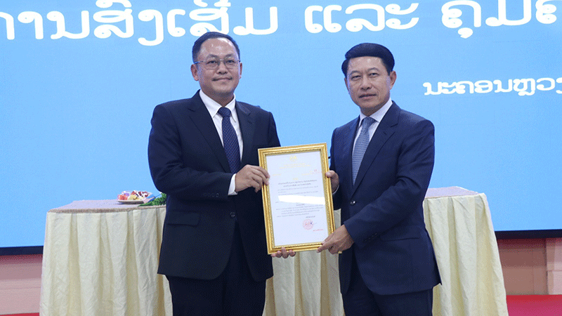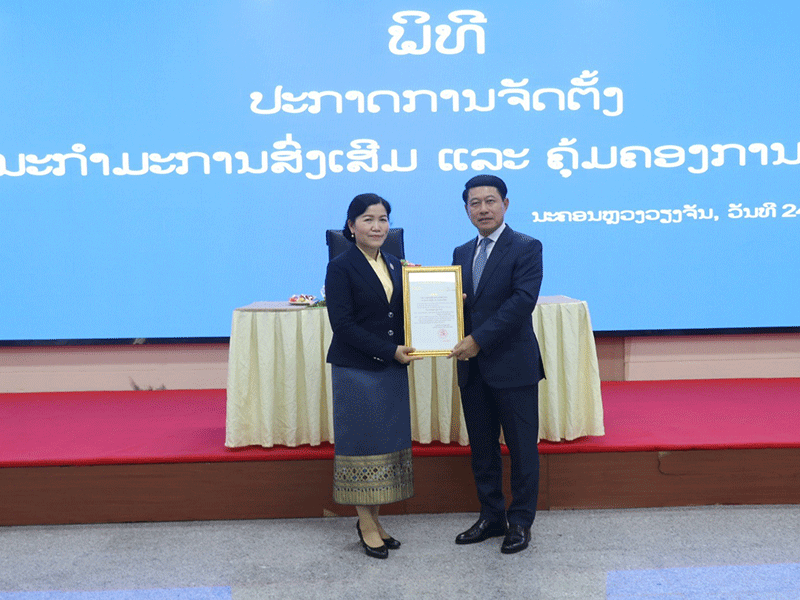 Standing Deputy Prime Minister and Chairman of the Investment Promotion and Management Committee, Mr Saleumxay Kommasith, presents an appointment letter to Deputy Minister, Vice Chair of the Investment Promotion and Management Committee and Standing Member, Mrs Phonevanh Outhavong, at the Investment Promotion and Management Committee Office on Tuesday. |