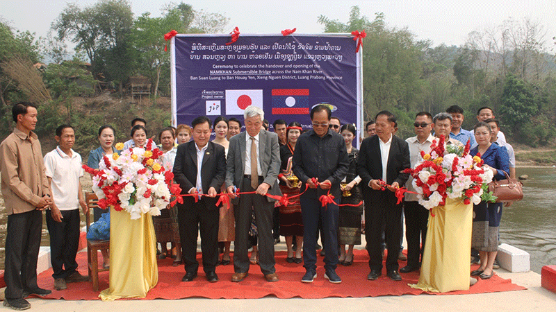 Officials from Luang Prabang province, representatives from the Japan Infrastructure Development Partnership (JIP), and Xiengngeun district authorities on Tuesday officially open a bridge over the Khan River, linking Suanluang and Huayyen villages. Construction of the bridge, which is 112 metres long and 5 metres wide, was funded by JIP at a cost of US$443,226. --Photo Pathetlao |