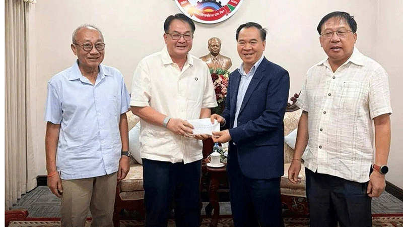 PSL Company officials give cash, household goods and other supplies worth more than 30 billion kip to the Ministry of National Defence for distribution to impoverished families in remote areas and those suffering from the effects of extreme weather. --Photo Pasaxon |