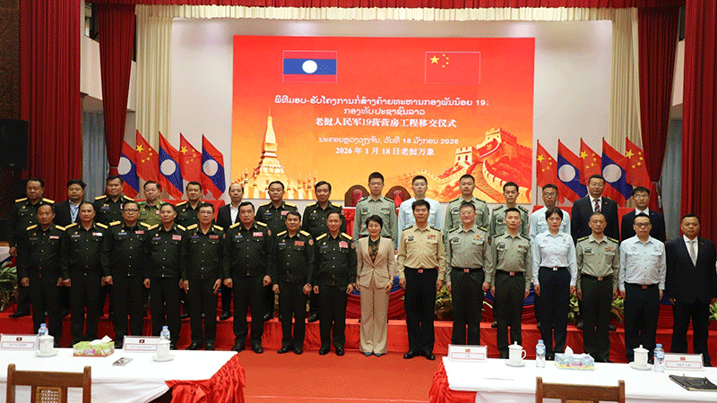 Minister of National Defence Lieutenant General Khamlieng Outhakaisone, Chinese Ambassador to Laos Ms Fang Hong and other senior officials from the two sides on Sunday attend a ceremony to hand over a recently-constructed battalion camp in Phongsaly province. Construction of the camp was supported by the Party, Government and Chinese People's Liberation Army. --Photo Lao People's Army News |