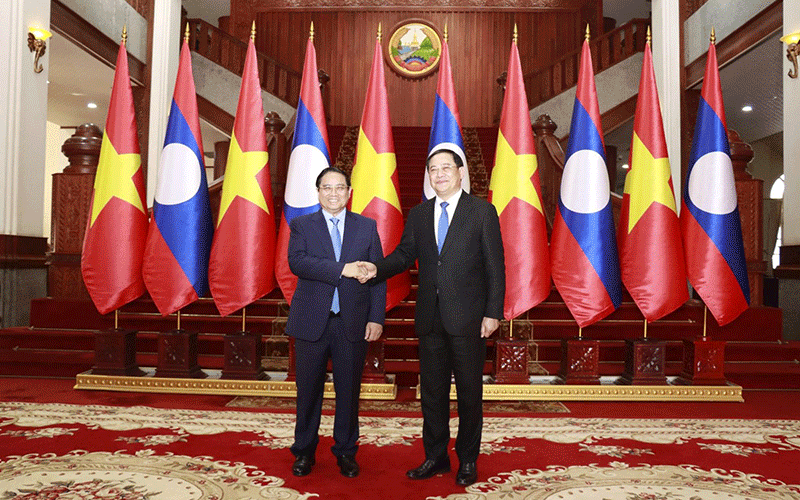 Laos’ Prime Minister Sonexay Siphandone received the Vietnamese Prime Minister Pham Minh Chinh at the Prime Minister’s Office, when the latter accompanied the General Secretary of the Communist Party of Vietnam, To Lam, on a state visit to Laos.