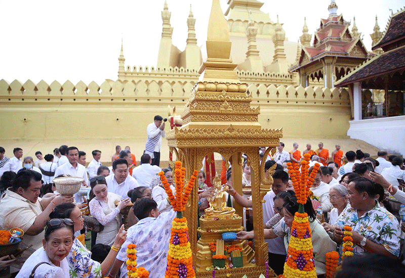 On the first day of the Lao New Year holiday on Monday, which marks the last day of the old year, government officials and local residents flock to That Luang temple in Vientiane to respectfully pour water over Buddha images, as part of a centuries-old tradition. |