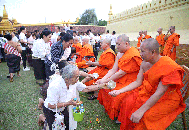 Elderly people trickle water over the hands of monks at That Luang temple as a sign of respect and to earn merit. |