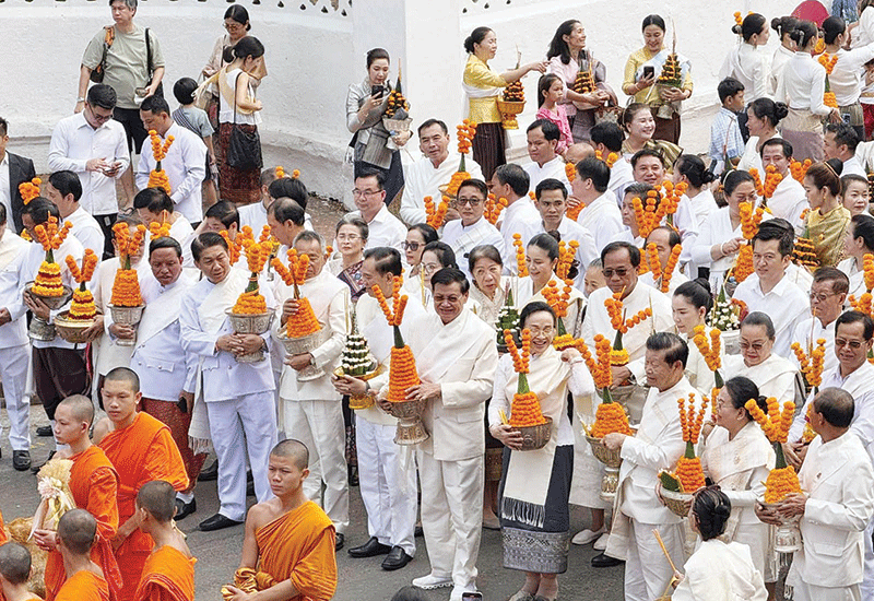 President Thongloun Sisoulith, government officials and local residents share in the Prabang Buddha procession. --Photo Bounpon Phannasack |