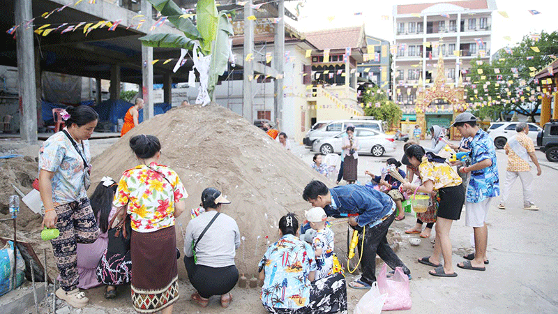 Worshippers pour water over Buddha images in the grounds of Simeuang temple in Vientiane, which is revered as the home of the city’s guardian. |