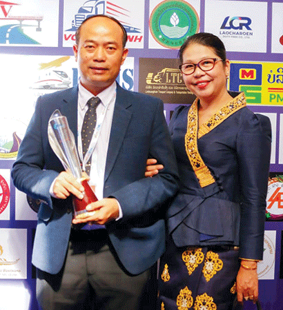 | Dr Langkone Xaignavong and his wife pose for a photo after receiving an ASEAN Business Award. |