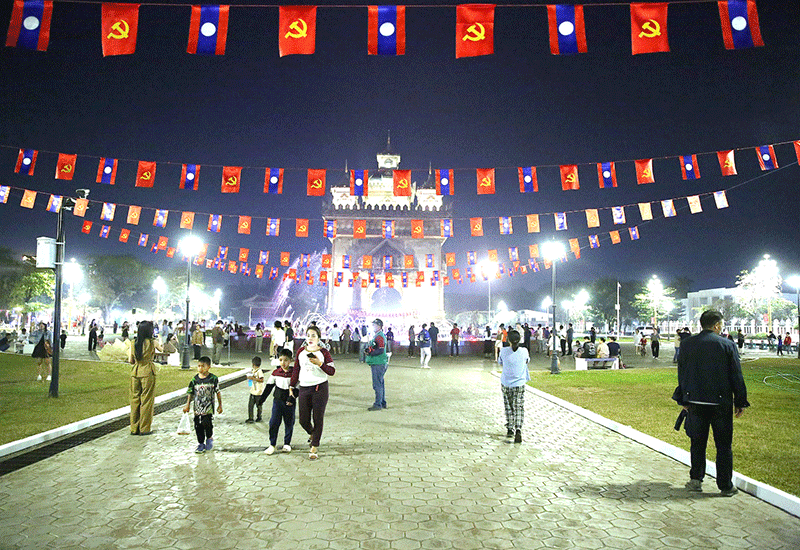 | Lao and Party flags adorn Patouxay Park and other important locations in the capital to mark the 50th anniversary of the Lao People’s Democratic Republic. |