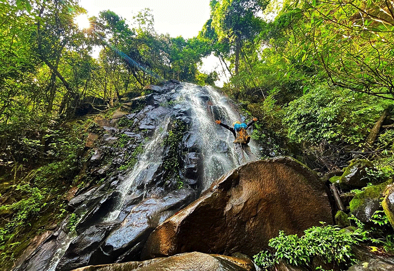 | A visitor enjoying the refreshing atmosphere by the waterfall at Namkat Yorla Pa in Oudomxay province. --Photo Namkat Yorla Pa |